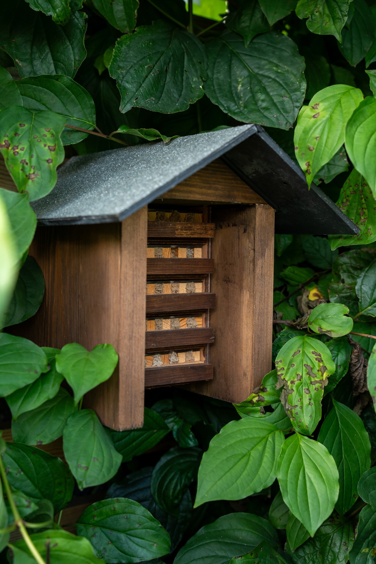 The roof is made of cement fibre slate, covered with high-quality roofing felt with a green mineral finish. The roof has large overhangs to provide rain protection to the hotel and the nest chambers inside.